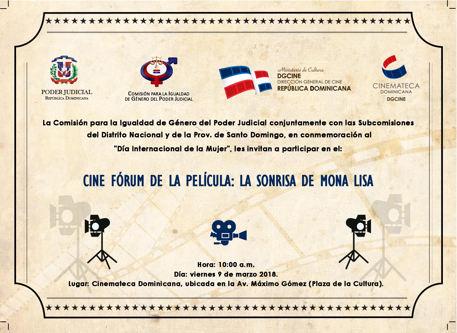 La misma tendrá lugar en la CInemateca Dominicana, ubicada en la Av. Máximo Gómez (Plaza de la Cultura), el viernes nueve (09) de marzo del año 2018, a las diez horas de la mañana (10:00 A.M.)